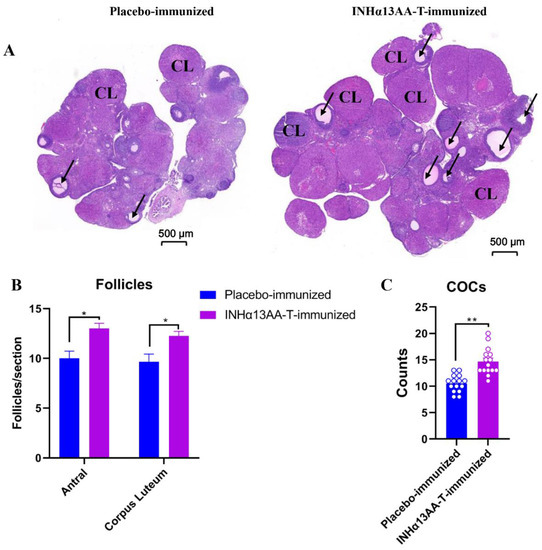 The efficacy of INHα13AA-T immunization in promoting folliculogenesis and ovulation in female rats was assessed at decapitation. Compared with placebo-immunized controls, there was a clear increase (p < 0.05) in the number of both antral follicles and corpora lutea (CL) in female rats following INHα13AA-T immunization (p < 0.05; Figure 4A,B). To directly assess the effects of INHα immunization on natural ovulation, we counted the cumulus–oocyte complexes (COCs) of female rats in the morning following mating. Consequently, compared with placebo-immunized controls, INHα13AA-T immunized females ovulated more eggs in natural cycles (p < 0.01; Figure 4C).