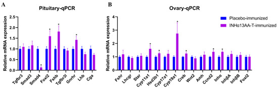 Effects of INHα13AA-T immunization on the expression of folliculogenesis-associated genes in the pituitary–ovary axis in female rats. (A) Relative expression of genes involved in folliculogenesis in the pituitary. (B) Relative expression of genes involved in folliculogenesis in ovaries. Abbreviations: Tgfbr3, TGFβ receptor 3; Smad3, SMAD family member 3; Smad4, SMAD family member 4; Foxl2, forkhead box L2; Fshb, follicle-stimulating hormone beta subunit; Tgfbr3l, TGFβ receptor type III-like; Lhb, luteinizing hormone beta subunit; Cga, glycoprotein hormones, alpha polypeptide; Fshr, follicle-stimulating hormone receptor; Lhcgr, luteinizing hormone receptor; Star, steroidogenic acute regulatory protein; Cyp11a1, cytochrome P450 family 11 subfamily A member 1; Hsd3β1, 3beta-hydroxysteroid dehydrogenase type 1; Cyp17a1, cytochrome P450 family 17 subfamily A member 1; Cyp19a1, cytochrome P450 family 19 subfamily A member 1 (aromatase); Creb, cAMP response element-binding protein; Wnt2, wingless-type MMTV integration site family, member 2; Amh, anti-Mullerian hormone; Ccnd2, cyclin D2; Inha, inhibin a; InhβA, inhibin beta subunit A; InhβB, inhibin beta subunit B. * p < 0.05 compared with placebo-immunized controls.