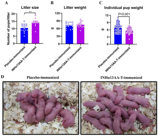 Efficacy of the effects of INHα13AA-T immunization on promoting fertility in female rats. (A) Litter size of pups born from placebo- or INHα13AA-T-immunized female rats. (B) Litter weight of pups born from placebo- or INHα13AA-T-immunized female rats. (C) Individual body weight of pups born from placebo- or INHα13AA-T-immunized female rats. (D) Representative photomicrographs of the litter sizes from placebo- or INHα13AA-T-immunized female rats. ** p < 0.01 compared with placebo-immunized controls.