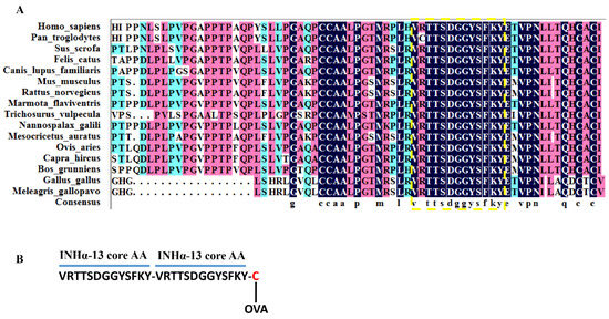 Using inhibin A mutant proteins, an epitope for high-affinity betaglycan binding was identified that spanned the outer convex surface of the human inhibin α subunit [9]. Homology modeling and amino acid residue mutation demonstrated that the residues of Val108, Thr111, Ser112, Phe118, Lys119 and Tyr120 (especially Thr111, Ser112 and Tyr120) on inhibin α subunit are the key residues that are indispensable for inhibin A binding with betaglycan [9]. We downloaded the inhibin α subunit peptide sequence of the main vertebrate species from the NCBI website. Via conservation analysis using DNAMAN (version 9), we found that a 13-amino acid sequence <VRTTSDGGYSFKY> within the betaglycan-binding epitope region on the human inhibin α subunit is highly conserved across species, as marked by the dotted box in Figure 7A. Particularly, all the key amino acid residues, i.e., residues of Val108, Thr111, Ser112, Phe118, Lys119 and Tyr120, that were reported to interact with betaglycan in humans [9] were 100% conserved across all the analyzed species (Figure 7A), indicating that such a core 13-amino acid sequence (INHα-13AA) is the essential binding site of inhibin A with betaglycan across species. Therefore, vaccines or antibodies developed with this 13-amino acid peptide sequence could be used to block the binding of endogenous inhibin A with betaglycan, thus abrogating its functional antagonism of activin-mediated Fshb transcription and improving FSH-dependent fertility in female mammals. We chose the sequence with the highest consensus out of this 13-amino acid epitope sequence of inhibin α subunit across species, i.e., VRTTSDGGYSFKY (INHα13AA), as a basis hapten to develop a novel inhibin vaccine. Theoretically, antigens or vaccines developed with this 13-amino acid sequence should be effective at least in all the analyzed species herein.