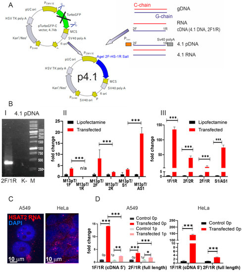 Genetic construct for HSAT2 (Acc No OP912406.2) overexpression. (A) Scheme of cloning (see the Materials and Methods Section 4 for details). (B) Panel I—OP912406.2 amplification with 2F/1R primers using p4.1 plasmid as a template. K−—NTC control; M—molecular weights (bp) marker (Sibenzyme, Russia). Panel II—qPCR quantification of A549 M13-oligo-dT cDNA (see Section 4.6 of Materials and Methods) with a different set of primers (see Table 2 for primer sequences and abbreviations) to prove (a) the amplified cDNA originated from the cloned sequence but not from genomic DNA and (b) it can be amplified with the S1/AS1 primer pair from our previous work. Panel III—qPCR with different primers set to quantify different parts of the transcript cDNA (1F/1R—5′ of cDNA; 2F/2R—3′ of cDNA; 2F/1R—the whole transcript; S1/AS1—amplification with previously described primers to prove the sequence homology with the previously described transcript). (C) DNA-RNA FISH of transfected A549 and HeLa cells. HSAT2 probe is shown in red, nuclei are counterstained with DAPI (blue), and scale bars are shown in the images. (D) Quantification of 4.1 (Acc No OP912406.2) transcription before and after the first splitting. *—p < 0.05, **—p < 0.01, and ***—p < 0.001.