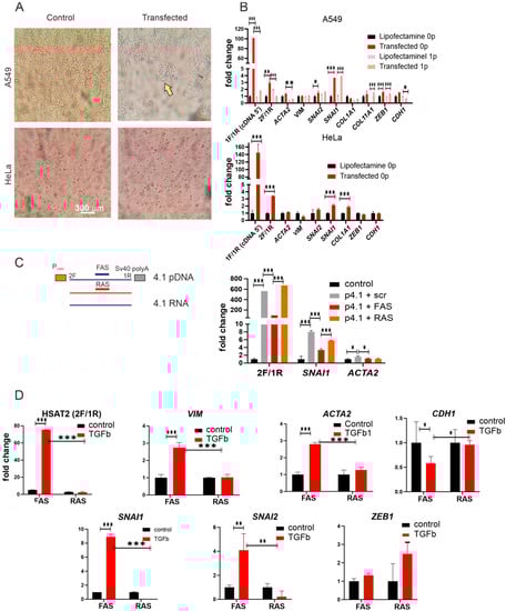 During visual inspection of transfected A549 cells, we noticed that the number of cells of non-epithelial morphology increased as compared to control cells treated with lipofectamine (Figure 4A). Therefore, we accessed the transcription of ‘master’ EMT-inducing genes (SNAI1, ZEB1, and SNAI2) encoding proteins involved in the process of EMT (Snail, Zeb1, and Slug) [33]. We also accessed markers of the mesenchymal phenotype (vimentin, collagens 1A1, 11A1, and alpha-smooth muscle actin) in the A549 cell line. Mesenchymal cells express little or no E-cadherin while epithelial cells are known for their high level of the protein and its mRNA [34]. We also added the HeLa cell line to the study to check whether the effect of transfection on EMT could be observed in other epithelial cancers where changes in morphology after transfection was not so clearly visible (Figure 4A).