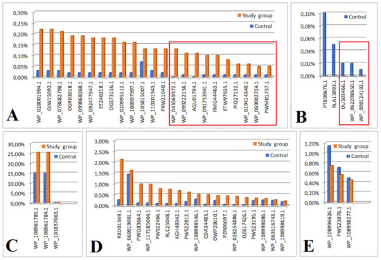 Bar graphs showing the comparison of proteins present in both the test group and the control group. Statistically significant results that remained significant after applying the Bonferroni correction are marked with a red square. Graph showing protein content comparisons for which emPAI values were: significantly higher in the study group compared to control (A); significantly higher in control compared to the study group (B); not significantly higher in the study group compared to the control (the results, however, trend toward significance) (C); not significantly higher in the study group compared to control (D); not significantly higher in control compared to study group (E). Expressions from Figure 2 are explained in Table 2.