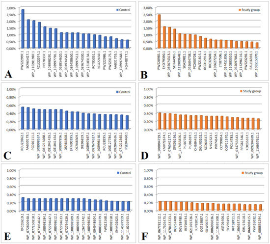 In both groups, we considered an ns prot score ≥ 60 as a cut-off value for the detected protein’s agreement with its theoretical equivalent. Based on the analysis of the proteinogram in the material collected from people from the study group (n = 18), 166 bacterial proteins were detected. Of these, 21 proteins had an emPAI value of 0 and were not included in further analysis. Out of the remaining 145 proteins, 52 were also present in the material from the control group (the differences in their content in individual materials are presented in Figure 1 and Figure 2, and Table 2 and Table 3). The remaining 93 proteins were present only in the material collected from the study group (their content in the material is shown in Figure 3B,D,F and Supplementary Figure S1B,D).