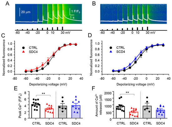 2.2.2. Suppressed SR Ca2+ Release with Unaltered Voltage Dependence in SDC4 Mice