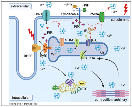 - Araya, R.; Liberona, J.L.; Cárdenas, J.C.; Riveros, N.; Estrada, M.; Powell, J.A.; Carrasco, M.A.; Jaimovich, E. Dihydropyridine receptors as voltage sensors for a depolarization-evoked, IP3R-mediated, slow calcium signal in skeletal muscle cells. J. Gen. Physiol. 2003, 121, 3–16. [Google Scholar] [CrossRef]