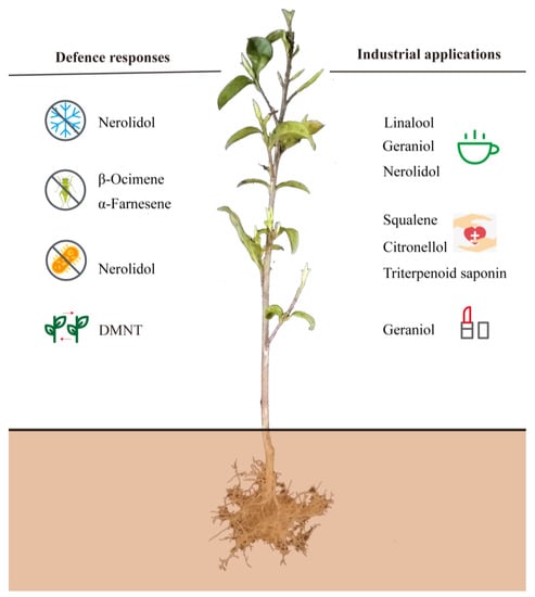 - Abbas, F.; Ke, Y.; Yu, R.; Yue, Y.; Amanullah, S.; Jahangir, M.M.; Fan, Y. Volatile terpenoids: Multiple functions, biosynthesis, modulation and manipulation by genetic engineering. Planta 2017, 246, 803–816. [Google Scholar] [CrossRef] [PubMed]