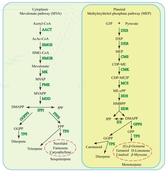 Terpenoid biosynthesis pathways in plants. MVA, mevalonic acid; AACT, acetyl-CoA acetyltransferase; HMG, 3-hy-droxy-3-methylglutaryl-CoA; HMGS, hydroxy methylglutaryl-CoA synthase; HMGR, hydroxy methylglutaryl-CoA reductase; MK, mevalonate kinase; MVAP, mevalonate-5-phosphate; PMK, phosphomevalonate kinase; MVAPP, mevalonate-5-diphosphate; MDD, mevalonate-5-diphosphate decarboxylase; IPP, isopentenyl diphosphate; IPPI, isopentenyl diphosphate isomerase; DMAPP, dimethylallyl pyrophosphate; GGPPS, GGPP synthase; FPPS, farnesyl pyrophosphate synthase; FPP, farnesyl pyrophosphate; GGPP, geranylgeranyl pyrophosphate; TPS, terpene synthase/cyclase; MEP, methylerythritol phosphate; DXS, 1-deoxy-D-xylulose-5-phosphate synthase; DXP, 1-deoxy-D-xylulose-5-phosphate; DXR, 1-deoxy-D-xylulose-5-phosphate reductoisomerase; CMS, CDP-ME synthase; CDP-ME, 4-diphosphocytidyl-2-C-methyl-D-erythritol; CMK, 4-diphosphocytidyl-2-C-methyl-D-erythritol kinase; CDP-ME2P, 4-(cytidine-5′ -diphospho)-2-C-methyl-D-erythritol-2-phosphate; MCS, 2-C-methyl-D-erythritol-2,4-cyclodiphosphate synthase; ME-cPP, 2-C-methyl-d-erythritol 2, 4-cyclodiphosphate; HDS, 4-hydroxy-3-methylbut-2-enyl diphosphate synthase; HMBPP, 4-hydroxy-3-methylbut-2-enyl diphosphate; HDR, 4-hydroxy-3-methylbut-2-enyl diphosphate reductase; DMAPP, dimethylallyl diphosphate; IDI, IPP/DMAPP isomerase; GPPS, GPP synthase; and GPP, geranyl pyrophosphate.