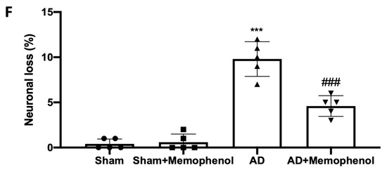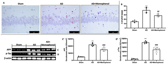 To demonstrate that MemophenolTM had action on amyloidosis typical of AD, we performed Congo red staining. The staining results showed that more Aβ deposits were present in the hippocampus of the AD group animals, while these deposits were significantly reduced after MemophenolTM treatment (Figure 2A). The result was further confirmed by an analysis of Aβ levels with an ELISA kit as presented in Figure 2B. Furthermore, we wanted to evaluate whether MemophenolTM was also able to act on two other specific markers of AD disease such as APP and p-Tau. APP (Figure 2C,C’) and p-Tau (Figure 2D,D’) expression levels were higher in the hippocampi from the AD group compared to the Sham group. Administration of MemophenolTM considerably lowered both levels (Figure 2C,C’,D,D’).