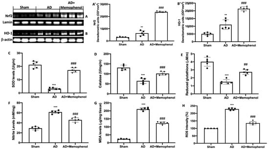 MemophenolTM administration decreased pro-oxidative modifications in the hippocampus. Western blot analysis of Nrf2 expression (A) and HO-1 (B) with related densitometric analysis (A’,B’), and biochemical analysis of SOD levels (C), CAT activity (D), GSH levels (E), nitrite levels (F), MDA levels (G), and ROS levels (H). For both analyses, n = 5 rats from each group and for each analysis were employed. A p-value of less than 0.05 was considered significant. ** p < 0.01 versus Sham, *** p < 0.001 versus Sham, ## p < 0.01 versus AD, ### p < 0.001 versus AD.