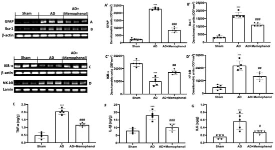 The effects of MemophenolTM on the activation of astrocytes and microglia and on the NF-κB pathway following AlCl3 injection. Western blot analyses of GFAP (A), Iba-1 (B), IkB-α (C), and NF-κB (D) expression with related densitometric analysis (A’–D’); ELISA kit of TNF-α (E), IL-1β (F), and IL-6 (G) levels. For the Western blot and ELISA analyses, n = 5 rats from each group and for each analysis were employed. A p-value of less than 0.05 was considered significant. *** p < 0.001 versus Sham, # p < 0.05 versus AD, ## p < 0.01 versus AD, ### p < 0.001 versus AD.
