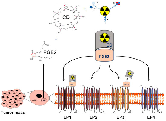 Schematic overview of the in vivo diagnostics and radioisotope therapy of PGE2-expressing and PGE receptor-positive tumors using radiolabelled CDs. Applying radioisotopes with diagnostic (γ) and therapeutic radiation (α or β), radiolabelled CDs complexed with tumor cell derived PGE2 may establish the basis of target-specific diagnostics and personalized radionuclide therapy of PGE2-expressing malignancies. CD: cyclodextrin; PGE2: prostaglandin E2.