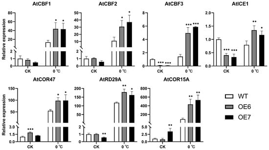 2.5. Overexpression of EjFAD8 under Low-Temperature Stress Increases Transcription of Low-Temperature-Tolerant Genes in Transgenic Arabidopsis