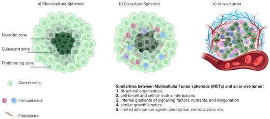The crosstalk between tumors and the components of the microenvironment, such as ECM, fibroblasts, and endothelial cells, is essential for tumor progression. The size and ratios of the different types of cells comprising the MCTS may affect cell-cycle-related phenomena. Browning et al. created a mathematical model for the study of MCTS structures as a function of overall size. The melanoma cell line’s MCTS had a limited size, independent of initial seeding cell number [].