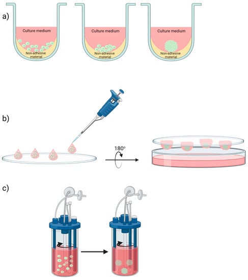 Another approach to develop MCTSs involves the use of agitating bioreactors; either spinner flasks [,,] or rotational culture systems [,]. Their common underlying principle is the continuous motion of the cell suspension, either by stirring (spinner flasks) or by rotation on a horizontal axis (rotational culture systems) (see Figure 2c). As a result of the continuous motion of the suspension liquid, the cells do not attach on the substrate surface, but rather aggregate and self-assemble []. Agitation-based methods are used for large-scale spheroid formation. Their design allows culture nutrient enhancement, waste disposal, and the homogeneity of the culture medium. Drawbacks of these methods include the use of expensive instruments, the utilization of large quantities of culture media, the production of a heterogeneous population of MCTSs, and the mechanical damage of cells []. The latter problem can be surpassed in the case of rotation wall vessels (RWV) developed by NASA to simulate microgravity, and which employ low sheer force on cells while in culture []. Table 1 below summarizes the benefits and drawbacks of the scaffold-free methods.