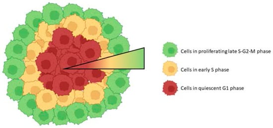 MCTS growth proceeds through three phases: initially, proliferation is similar throughout the volume of a growing multicellular tumor spheroid. Next, a proliferation gradient is formed with the center of the spheroid remaining viable, but the cell cycle is arrested. During the last phase, a necrotic core is developed. Cells within the tumor spheroid tend to pass the restriction point and commit to the cell cycle the closer they are to the surface; thus, an increase in G1 phase duration is observed in cells located closer to the center of the spheroid [,]. Significant differences in the S/G2 cell ratio are observed between the inner and outer layers of the MCTS, with the outer region being enriched in S/G2 cells [] (see Figure 4).