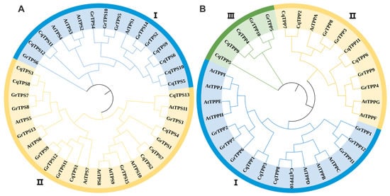 To assess the TPS or TPP evolutionary relationship of Chenopodium quinoa Willd, Arabidopsis thaliana (L.), and Gossypium hirsutum Linn. [,,,], the phylogenetic trees of the TPS and TPP gene families were constructed, respectively. According to the phylogenetic tree, the TPS family members were divided into two classes (Figure 1A). Class I includes four AtTPSs, six GrTPSs, and six CqTPSs, and Class II includes seven AtTPSs, nine GrTPSs, and seven CqTPSs. The TPP family is divided into three classes (Figure 1B). Class I includes seven AtTPPs, six GrTPPs, and four CqTPPs, Class II includes three AtTPPs, four GrTPPs, and four CqTPPs, and Class III only includes three CqTPPs and two GrTPPs without an AtTPP homologue.