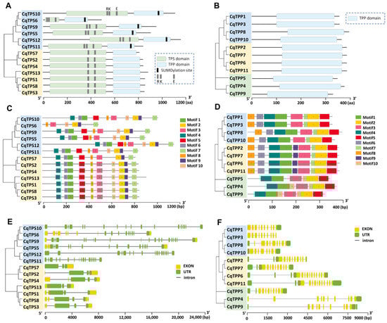 Analysis of gene and protein primary structures of CqTPSs and CqTPPs. (A,B) Conservative domain analysis of CqTPS (A) and CqTPP (B) proteins. Class I CqTPS proteins contain a catalytic triad residue, Arg (R)/Lys (K)/Glu (E) (dark gray bars), and a SUMOylation site at the C-terminal (black bars). (C,D) Motif distribution analysis of CqTPS (C) and CqTPP (D) proteins. (E,F) Gene structure analysis of CqTPSs (E) and CqTPPs (F).