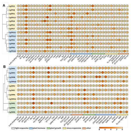 Analysis of cis-acting elements in promoters of CqTPS (A) and CqTPP (B) genes. The categorized groups are indicated by color bars. The number of each element is indicated in the circles and is also shown by different colors presented in a color scale in the lower panel.