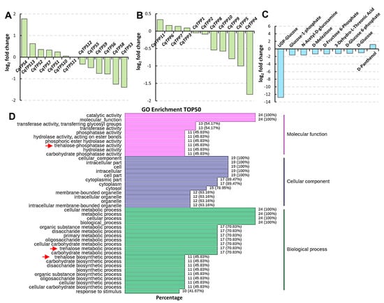 Transcriptome analysis of CqTPSs and CqTPPs and related processes and metabolism analysis of related metabolites in quinoa leaves undergoing saline-alkali stress. (A,B) Transcriptome analysis of expression levels of CqTPS and CqTPP family genes in quinoa leaves. Two-week-old quinoa seedlings were treated with a carbonate solution containing 100 mM Na2CO3:NaHCO3 = 1:9 for two weeks. (C) Metabolism analysis of the differently accumulated metabolites (DAMs) in the starch and sucrose metabolism pathway. (D) Go enrichment analysis of total differently expressed genes (DEGs). Arrows, trehalose-related processes.