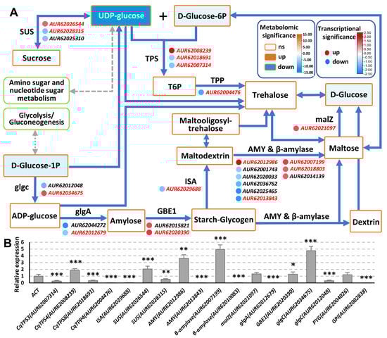 GO Analysis of starch and sucrose metabolism (main routes related to trehalose metabolism) in quinoa leaves. (A) Overview of the starch and sucrose metabolism pathway in quinoa leaves in response to saline-alkali stress. Rectangles with orange frames, metabolites; circles, DEGs; blue solid lines with arrows, directions of the processes; rectangles with green frames, other metabolism pathways; gray dotted lines, connection of the starch and sucrose metabolism pathway with other metabolism pathways. The colors of rectangles and circles indicate significances, which are presented in color scales. The genes highlighted in red were detected by RT-qPCR. (B) RT-qPCR analysis of the DEGs. UBQ9 (AUR62020068) was used as endogenoue control. Three independent experiments per sample, three replicates per experiment. *, p < 0.05; **, p < 0.01; ***, p < 0.001; Student’s t-test. Abbreviations: AMY, α-amylase; GBE1, glycogen branching enzyme; glgA, glycogen synthase; glgC, ADPglucose pyrophosphorylase; ISA, isoamylase; malZ, maltodextrin glucosidase; SUS, sucrose synthase; T6P, trehalose 6-phosphate; TPP, trehalose 6-phosphate phosphatase; TPS, trehalose-6-phosphate synthase; UDP-glucose, uridine diphosphate glucose.