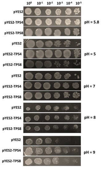 To characterize the regulatory roles of CqTPS genes in response to saline-alkali stress, we determined the growth of yeast (Saccharomyces cerevisiae) harboring CqTPS4/8 genes exposed to saline-alkali stress. The results indicate that CqTPS4- and CqTPS8-expressing yeast cells exhibited an increased survival ratio compared to the control (with empty vector) on an SC-Ura medium containing 25 mM NaHCO3 with pH = 5, 7, 8, and 9 (Figure 6), suggesting that CqTPS4 and CqTPS8 are involved in the saline-alkali stress response.