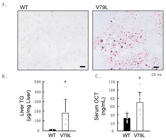 2.3. Elevation of Hepatic Triglycerides and Serum Ornithine Carbamoyltransferase Levels in Mutant Mice