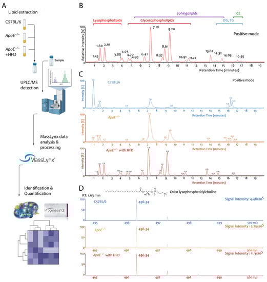 In recent years, the mass spectrometry (MS)-based lipidomic assay has emerged as a promising approach for better understanding of CVD pathophysiology and exploring etiological determinants [,]. Sophisticated bioinformatics and biostatistics could aid in the discovery of new lipid mediators, metabolites, or disease biomarkers [,]. Different lipid species can be distinguished using ACQUITY® ultra-performance liquid chromatography (UPLC) equipped with a charged surface hybrid (CSH) C18 column. The separation is based on the length of the acyl chain, number, position, and geometry of double bonds []. UPLC-MS data can be processed using Progenesis QI® software for lipid identification and quantification []. We sought to explore untargeted lipidomic analysis for apoE−/− and HFD-fed apoE−/− mice in contrast to wild-type controls employing this modern approach. By analyzing total lipid extracts of plasma and LDL, we aimed to detect molecular fingerprints of apoE−/− and HFD-fed apoE−/− mice for atherosclerosis and CVD.