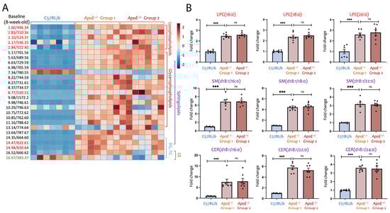 Altered lipid profile in the respective animal groups at eight weeks of age. We chose m/z signals with (1) higher abundance, (2) a fold change greater than 2, and (3) p values less than 0.001 to be the selecting markers of untargeted plasma lipidomic profiling of all the three groups of mice at the 8-week-old baseline. (A) A total of 27 markers were chosen to represent various lipid components between groups in a heatmap. By the exact mass and retention time, some of the 27 markers were identified. (B) LPC(16:0), LPC(18:0), LPC(20:0), SM(d18:1/16:0), SM(d18:1/18:0), SM(d18:1/22:0), CER(d18:1/16:0), CER(d18:1/22:0), and CER(d18:1/24:0) were compared among groups. N = 7 in each group. The data are presented in the fold change. *** p < 0.001, ns: not significant between groups. Abbreviations: apoE−/−: apolipoprotein E knockout; LPC: lysophosphatidylcholine; SM: sphingomyelin; CER: ceramide.