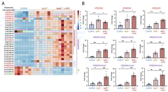 Elevated levels of sphingomyelin and ceramide in high-fat diet-fed apoE−/− mice. The analysis of untargeted lipidomic data was carried on as described earlier. (A) A total of 30 markers were picked from each category and displayed in a heatmap. Of the 30 markers, 27 were the same as those identified at the baseline. (B) LPC(16:0), LPC(18:0), LPC(20:0), SM(d18:1/16:0), SM(d18:1/18:0), SM(d18:1/22:0), CER(d18:1/16:0), CER(d18:1/22:0), and CER(d18:1/24:0) were the most abundant lipid species in each category. Levels of each lipid species were compared among groups (N = 7 each). The information is provided in the fold change format. *** p < 0.001, ** p < 0.01, * p < 0.05, ns: not significant between groups. Abbreviations: apoE−/−: apolipoprotein E knockout; HFD: high-fat diet; NCD: normal-chow diet; LPC: lysophosphatidylcholine; SM: sphingomyelin; CER: ceramide.