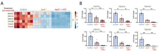 Analysis of cholesteryl ester levels in high-fat diet-fed apoE−/− mice. (A) By the exact mass and retention time, CEs were analyzed similarly to other lipid parameters. CE(18:2), CE(20:2), CE(20:4), CE(22:2), CE(22:4), and CE(22:6) were the most abundant CE species in mice. CE levels were compared among three groups. Data were presented in a heatmap. (B) CE(18:2), CE(20:2), CE(20:4), CE(22:2), CE(22:4), and CE(22:6) were all reduced significantly in apoE−/− mice given NCD or HFD. Notably, the CE levels were lowest in apoE−/− mice on a high-fat diet. The data are presented in the fold change. *** p < 0.001, ** p < 0.01. Abbreviations: apoE−/−: apolipoprotein E knockout; HFD: high-fat diet; NCD: normal chow diet; CE: cholesteryl ester.