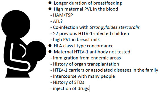 Other risk factors for carrier mothers include HAM/TSP complications [94], co-infection with Strongyloides stercoralis [94], ≥2 previous children with HTLV-1 infection [91], high PVL in breast milk [95], and human leukocyte antigen (HLA) class I type concordance between mother and child via breastfeeding [96]. Furthermore, in mothers with untested HTLV-1 antibodies from endemic areas, a lack of effective intervention may result in MTCT.