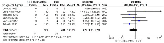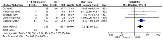 A 2021 systematic review included a meta-analysis of the risk of MTCT of STBF ≤ 3 months and STBF ≤ 6 months compared with that of ExFF [103]. The meta-analysis integrated five retrospective studies and the cohort study by Itabashi et al.; comparing STBF ≤ 3 months (including <90 days) with ExFF found no statistical difference in the risk of MTCT between the two groups (pooled risk ratio (RR): 0.72, 95% CI: 0.30–1.77) (Figure 2) [103]. In contrast, a meta-analysis integrating five retrospective studies and comparing STBF ≤ 6 months and ExFF showed that STBF ≤ 6 months was associated with an approximately 3-fold higher risk of MTCT than that of ExFF (pooled RR: 2.91, 95% CI: 1.69–5.03) (Figure 3) [103]. Although there was no statistical difference in the MTCT rates between STBF ≤ 3 months and ExFF, Rosadas et al. documented that all studies included in the meta-analysis were observational studies in Japan [84].
