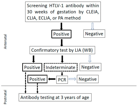 HTLV-1 antibody screening is usually performed within 30 weeks of gestation, allowing carriers sufficient time to obtain more information from their healthcare providers before delivery and select the appropriate feeding regimen for their infants. Pregnant women with positive screening results undergo confirmatory antibody testing using an algorithm (Figure 4) [54,129]. If a pregnant woman is determined to be a carrier, the healthcare provider will explain the risks of MTCT and preventive measures to the extent possible before delivery. If the mother does not have strong concerns about the risks of HTLV-1 associated diseases and interventions for MTCT, infant and child health examinations are performed on the same schedule (at 1, 3–4, 7–10, 18, and 36 months) as for infants born to non-carrier pregnant women. Testing for HTLV-1 antibodies at the age of three years to assess MTCT is recommended, but not mandatory [83].