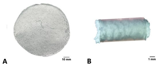 To obtain the biomaterial for polymer conduit production, a PHB/PHBV blend was preliminarily prepared. For this purpose, 3% (w/v) polymer solutions of PHB and PHBV in chloroform were mixed in a mass ratio 1:1. The polymer conduits were manufactured by performing multiple layer-by-layer casting from this PHB/PHBV blend solution using a rotating stainless steel drum with a 2 mm diameter with subsequent chloroform evaporation. Then, the drum with the deposited polymer was placed in water and a polymer cylinder was carefully removed from the drum. The obtained PHB/PHBV cylinders–conduits had walls that were 100 m thick as measured using the electronic caliper (Krino, Monticello Brianza, Italy). Finally, the porous scaffold-2s obtained at the previous stage were cut and placed in these polymer conduits in the manner to fill the space inside the conduit as full as possible.