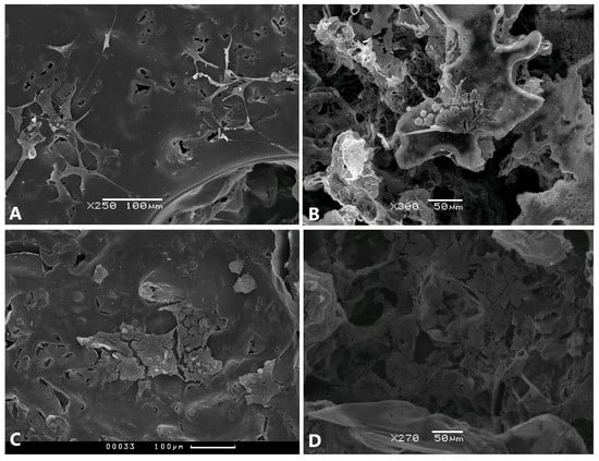 The SEM images of cell attachment and growth on scaffolds. (A) MSCs on scaffold-1s; (B) and MSCs on scaffold-2s; (C) 3T3 fibroblasts on scaffold-1s; (D) 3T3 fibroblasts on scaffold-2s. ×250–300. Original microphotographs (A–D) in good resolution are presented in Supplemental images for Figure 4. Histological evaluation of tissue reaction to PHB films as Control is presented in Supplemental Materials, Figure S3.