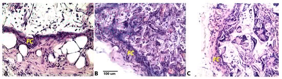 Histological evaluation of tissue reaction to scaffold-1 subcutaneous implantation on 7th (A), 14th (B), and 60th (C) days. The yellow mark FC shows the fibrous capsule formation. Hematoxylin-eosin staining; ×200. Original microphotographs (A, B, and C) in good resolution are presented in Supplemental images for Figure 5. Histological evaluation of tissue reaction to PHB films as Control is presented in Supplemental Materials, Figure S3.