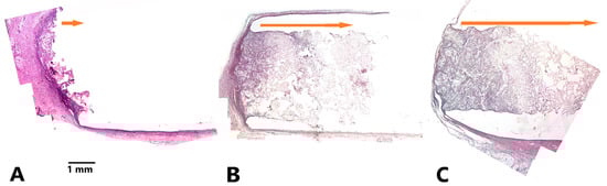 Histological evaluation of tissue reaction to scaffold-2 subcutaneous implantation on 7th (A), 14th (B), and 28th (C) days. Gradual germination of connective tissue into the cavity of the tubule along scaffold matrix can be observed. The arrow shows the direction of germination of loose connective tissue. Hematoxylin-eosin staining ×100. Original microphotographs (A–C) in good resolution are presented in Supplemental images for Figure 6.
