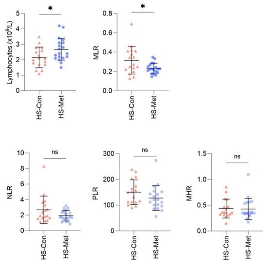 | NLR | HS Control (n = 17) | 2.69 | 0.027 |