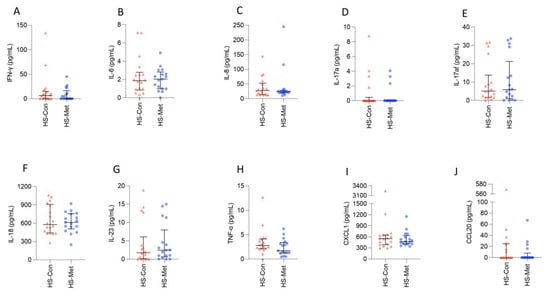 - Jimenez-Gallo, D.; de la Varga-Martinez, R.; Ossorio-Garcia, L.; Albarran-Planelles, C.; Rodriguez, C.; Linares-Barrios, M. The Clinical Significance of Increased Serum Proinflammatory Cytokines, C-Reactive Protein, and Erythrocyte Sedimentation Rate in Patients with Hidradenitis Suppurativa. Mediat. Inflamm. 2017, 2017, 2450401. [Google Scholar] [CrossRef]