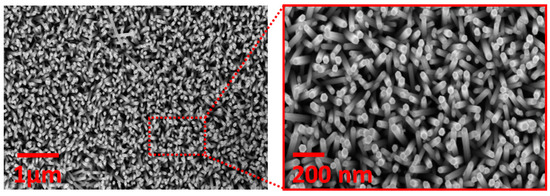 ZnO-NR were synthesized as described in the Materials and Methods section. Field Emission Scanning Electron Microscopy (FE-SEM) imaging was performed on the produced materials using a Zeiss Auriga SEM, operating at an accelerating voltage of 5 keV. From the FE-SEM analysis, it was found that the ZnO-NRs have diameters between 40 and 50 nm and lengths that can approach 800 nm after sonication (Figure 1).