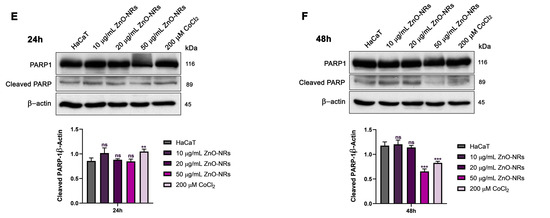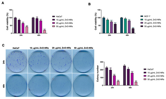 Cell viability was determined using the MTT assay as previously described [32]. Briefly, 3 × 104 HaCaT and MCF-7 cells were plated in 24-well culture plates and cultured overnight. Subsequently, the cells were incubated with 0, 10, 20 and 50 µg/mL ZnO-NRs in DMEM and cultured for 24 or 48 h. Tetrazolium salts (MTT: 3-(4,5-dimethylthiazol-2-yl)-2,5-diphenyltetrazolium bromide, 5 mg/mL suspended in PBS) were added to each well and incubated for 4h. The formazan crystals were extracted from the cells with a solubilizing solution (DMSO). An ELISA reader (Multiskan™ FC Microplate Photometer, Thermo Fisher Scientific) was used to measure the absorbance at a wavelength of 570 nm and reference length of 630 nm. The results were expressed as a percentage of the viability of untreated cells.