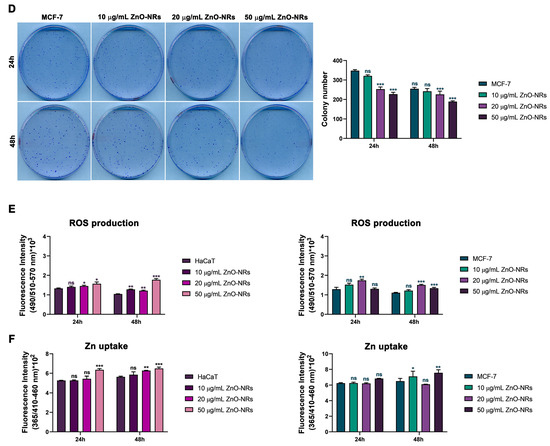 ZnO-NRs’ effects on HaCaT and MCF-7 cells. HaCaT and MCF-7 cells were either untreated or treated with the indicated ZnO-NR concentration for 24 and 48 h. The ncrease of ZnO-NR concentration caused a decrease (A,B) in cell viability and (C,D) clonogenicity ability. (E) Intracellular ROS measured in both cell lines after ZnO-NR treatment using 2′,7′-dichlorofluorescin diacetate (DCFH-DA). (F) Intracellular Zn2+ measured after ZnO-NR treatment using Zinquin. Experiments were repeated three times. * p < 0.05, ** p < 0.01, and *** p < 0.001. ns, not significant.