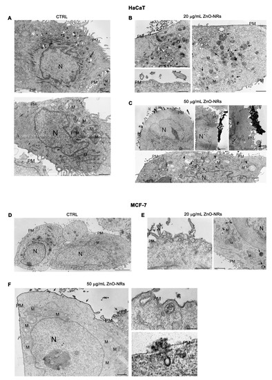 Ultrastructural analysis of HaCaT and MCF-7 cells after ZnO-NR treatment. HaCaT and MCF-7 cells were either untreated or treated with the indicated ZnO-NR concentration for 24 h. (A) TEM images of untreated HaCaT cells showing normal cellular morphology. Size bars, 1 µm. (B) TEM images of HaCaT cells treated with 20 µg/mL ZnO-NRs showing the extracellular presence and plasma membrane deposition of ZnO-NRs. Arrows point to autophagic vacuoles. Size bars, 1 µm for the upper left and right image and 2 µm for the lower left image. (C) TEM images of HaCaT cells treated with 50 µg/mL ZnO-NRs showing increasing extracellular (upper left) and intracellular ZnO-NRs accumulation (lower right) as well as presence of autophagic bodies (arrows) and damaged mitochondria with disruption/loss of the cristae (arrowhead) (lower image). Size bars, 2 µm for the upper image and 1 µm for the lower left and right images. (D) TEM image of untreated MCF-7 cells showing cancer cell morphology. Size bar, 5 µm. (E) TEM images of MCF-7 cells treated with 20 µg/mL ZnO-NRs showing presence of ZnO-NRs along the microvilli of the plasma membrane, in pinocytic vacuoles localized beneath the plasma membrane (left image), and also intracellularly (arrows in right image). Size bars, 0.5 µm (left) and 1 µm (right). (F) TEM images of MCF-7 cells treated with 50 µg/mL ZnO-NRs showing deposition along the entire surface of the plasma membrane (arrows) and in intracellular vacuoles. Size bars, 1 µm (left image) and 0.2 µm (right image). In all panels: N, nucleus; M, mitochondrion; PM, plasma membrane; G, Golgi.