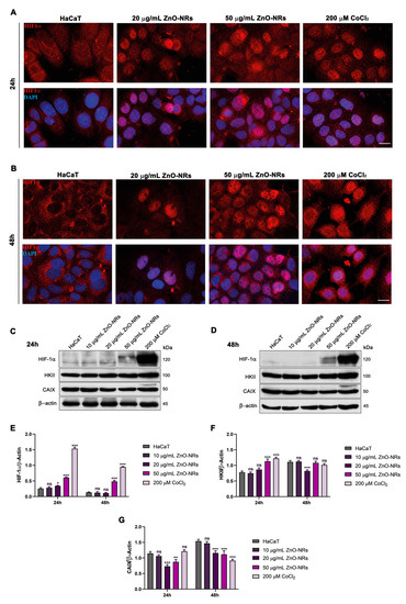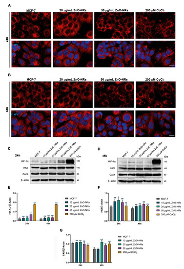 Moreover, we determined the expression of HIF-1α target genes HKII and CAIX. Figure 4C,D,F,G shows the increase in HKII expression after 24 h treatment of HaCaT cells with 50 µg/mL ZnO-NRs. Conversely, we observed a decrease in CAIX expression after 24 and 48 h with 20 and 50 µg/mL ZnO-NRs (Figure 4G). It must be noted that the same trend of increased HKII after 24 h and decreased CAIX after 48 h was obtained with the CoCl2 treatment used as a positive hypoxic control. In the case of MCF-7 cells, we observed a similar increase in HIF-1α expression. However, HIF-1α localization was mostly perinuclear and was not accompanied by nuclear translocation (Figure 5A–E).