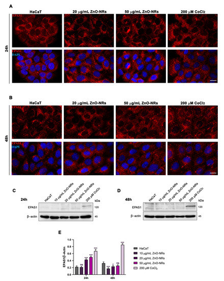 Moreover, the analysis of HIF-1α target genes revealed an increase in HKII protein levels after 24 h and CAIX after 48 h of ZnO-NR treatment (Figure 5C,D,F,G). Since the hypoxia response is also controlled by EPAS1 that is expressed by MCF-7 cells [21], we studied EPAS1 expression and its intracellular localization after ZnO-NR treatment. The results showed that HaCaT cells have a low perinuclear expression of EPAS1 whose increase is concentration-dependent at 24 h, while at 48 h EPAS1 expression tended to decrease at lower concentrations of ZnO-NRs (10 and 20 µg/mL) (Figure 6A,B) and showed no variation compared with control cells at 50 µg/mL ZnO-NRs (Figure 6C–E).
