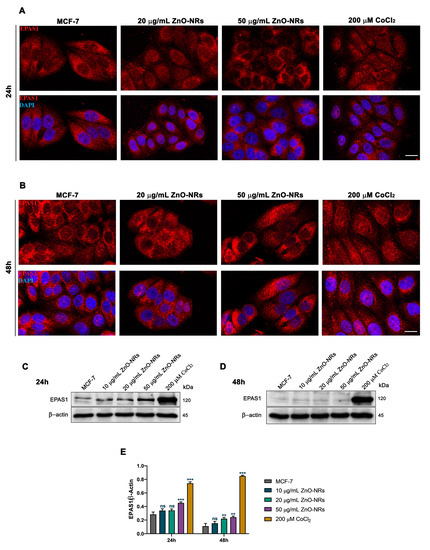MCF-7 cells have a high basal EPAS1 expression level that is further increased by ZnO-NRs after 24 h and 48 h (Figure 7).