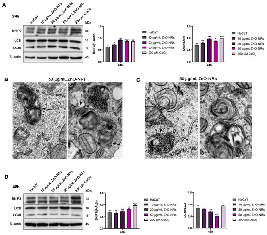 ZnO-NRs’ effects on autophagy and mitophagy in HaCaT cells. HaCaT cells were either untreated or treated with the indicated ZnO-NR concentration for 24 and 48 h. (A) BNIP3, LC3I, and LC3II expression after 24 h treatment with 10, 20, and 50 µg/mL ZnO-NRs. Right side, densitometric analysis of BNIP3, LC3I, and LC3II protein expression. (B) TEM images of HaCaT cells treated with 50 µg/mL ZnO-NRs for 24 h showing the presence of mitophagic vacuoles (black arrows). Size bars, 0.5 µm. (C) TEM images of HaCaT cells treated with 50 µg/mL ZnO-NRs for 24 h showing the presence of autophagic and mitophagic vacuoles (black arrows). Size bars, 0.5 µm. (D) BNIP3, LC3I, and LC3II expression after 48 h treatment with 10, 20, and 50 µg/mL ZnO-NRs. Right side, densitometric analysis of BNIP3, LC3I, and LC3II protein expression. (E,F) Poly(ADP-ribose) polymerase 1 (PARP1) and cleaved PARP expression after 24 and 48 h treatment with 10, 20, and 50 µg/mL ZnO-NRs. Densitometric analysis is reported below each blot. Experiments were repeated three times. * p < 0.05, ** p < 0.01, and *** p < 0.001. ns, not significant. In all experiments, hypoxia, induced by 200 µM CoCl2, was used as positive control. β-actin was used as loading control.