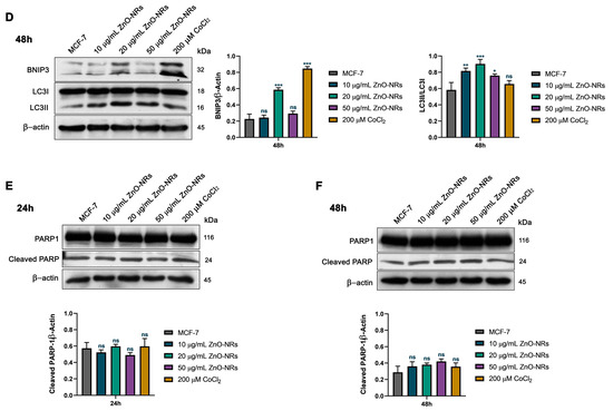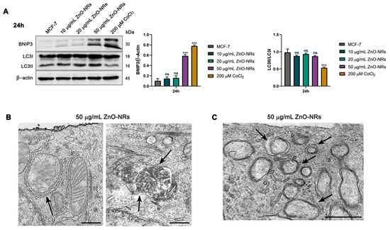 Figure 8A shows that in HaCaT epithelial cells, ZnO-NR treatment increased mitophagy marker Bcl2 interacting protein 3 (BNIP3) and autophagy marker microtubule-associated protein 1A/1B light chain 3 (LC3II) after 24 h. TEM analysis after 24 h of ZnO-NR treatment, confirmed the presence of mitophagic and autophagic vacuoles indicated by the arrows in Figure 8B,C, respectively. Extending the ZnO-NR treatment to 48 h maintained the increase in BNIP3 levels only with the 50 µg/mL dose while decreasing LC3II levels (Figure 8D), an effect probably due to the toxicity of this ZnO-NR concentration. Expression of the apoptotic marker PARP showed that ZnO-NR treatment did not affect PARP cleavage after 24 h (Figure 8E) while it decreased it after 48 h at 50 µg/mL ZnO-NRs (Figure 8F). In the case of breast cancer MCF-7cells, we documented a marked increase in the expression of the mitophagy marker BNIP3 after treating the cells with 50 µg/mL ZnO-NRs for 24 h (Figure 9A).