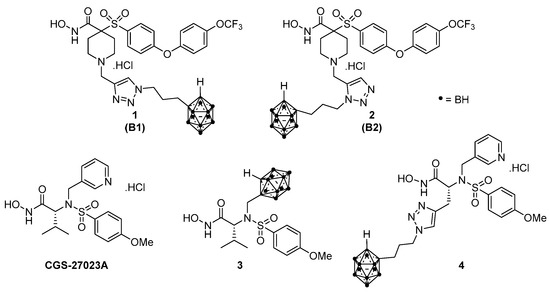 Herein, we describe the synthesis of carborane-containing hydroxamate MMP inhibitors based on a broad-spectrum MMP inhibitor CGS-27023A [33] (Figure 1). The IC50 values of CGS-27023A inhibition potency at MMP-1, -2, -9, and -13 are 15, 20, 9 and 5 nM, respectively [34]. There are three important elements of the pharmacophore within CGS-27023A: (1) hydroxamic acid, (2) the sulfonamide functional group, and (3) the methoxy aryl hydrophobic tail. These moieties play a key role in pharmacokinetics and binding to the MMP active site [35]. This has led us to explore possibilities of incorporating ortho-closo carborane as a direct replacement of isopropyl and pyridine substituent within CGS-27023A molecule without losing substantial potency. These MMP ligands are candidates for BNCT therapy.